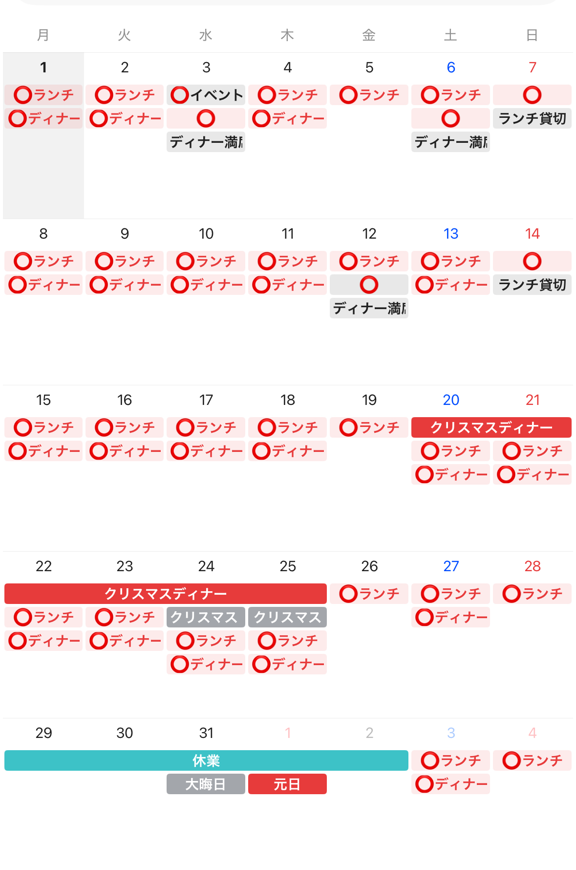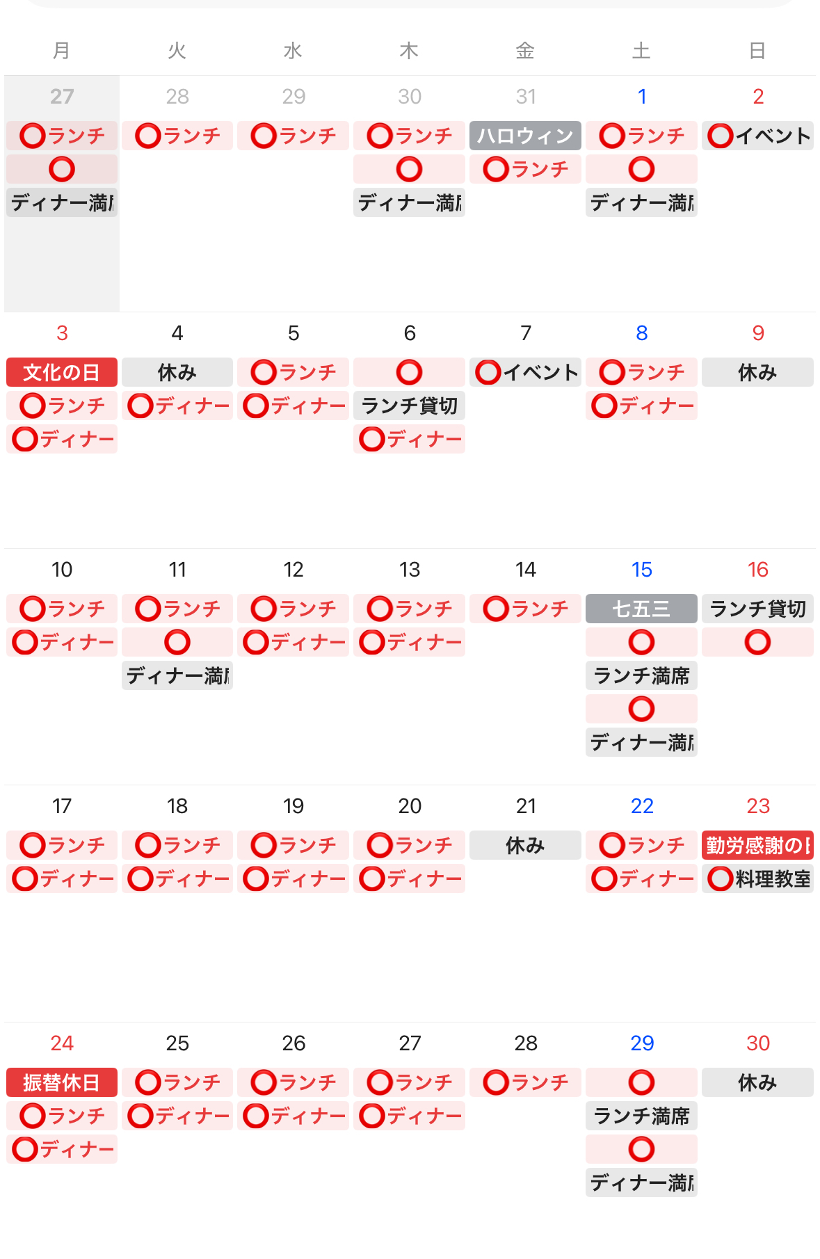 1日(土)ディナー、2日(日)ランチ(イベント)、6日(木)ランチ、7日(金)ランチ(貸切)、11日(火)ディナー、15日(土)ランチおよびディナー、29日(土)ランチおよびディナー