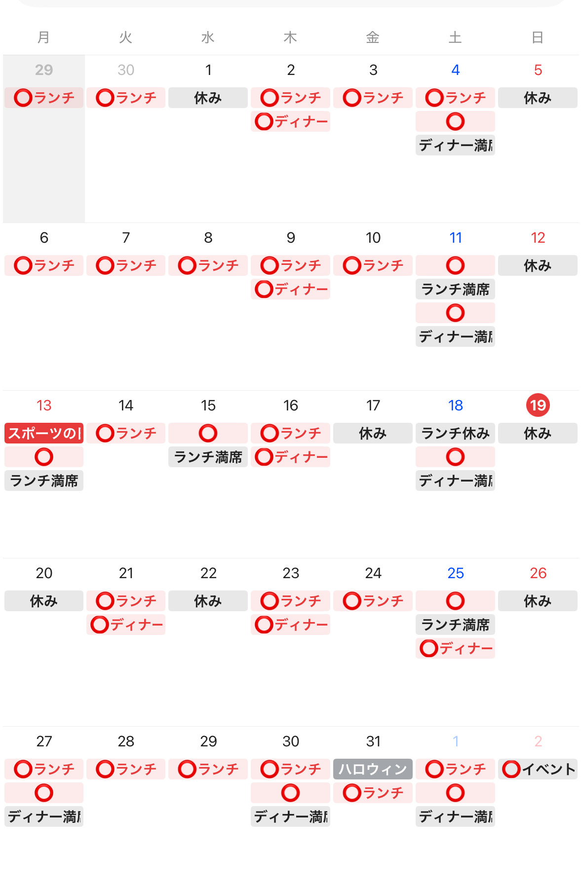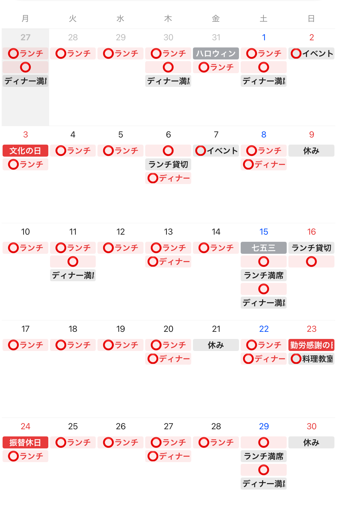 1日(土)ディナー、2日(日)ランチ(イベント)、6日(木)ランチ、7日(金)ランチ(貸切)、11日(火)ディナー、15日(土)ランチおよびディナー、29日(土)ランチおよびディナー